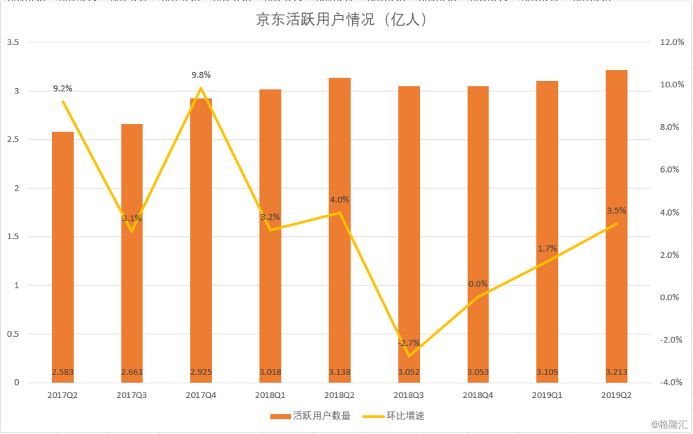 本季度京东活跃用户稳定增长,营收增速更是止住下滑趋势,重回增长状态,可谓扬眉吐气。