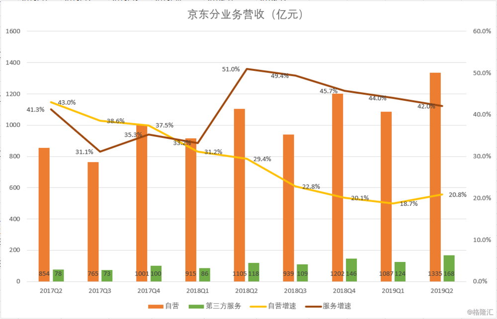 分到业务上,本季度京东自营业务营收1335亿元,同比增长20.8%,第三方业务营收为168亿元,保持了42%的增速,占总营收比重11.2%。