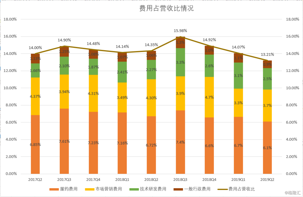 京东第三方物流订单的增长带动了履约效率进一步提升,履约费用率下降至6.1%。而从整个费用情况来看,京东各方面费用占营收比均有下降,总费用占营收比重为13.21%,已降至近两年最低。