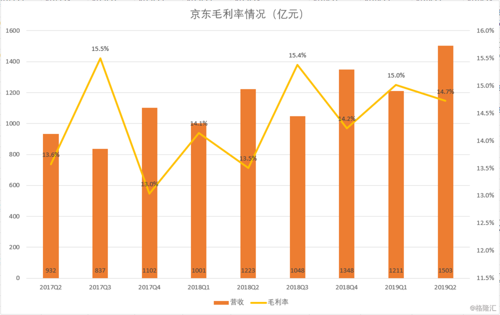 本季度京东的毛利率为14.7%,按照虎嗅研究总监Eastland的说法,电商履约费用必不可缺也应该计入成本当中。不过从历史情况来对比,第三方服务营收的增长有带动京东毛利率的提升。