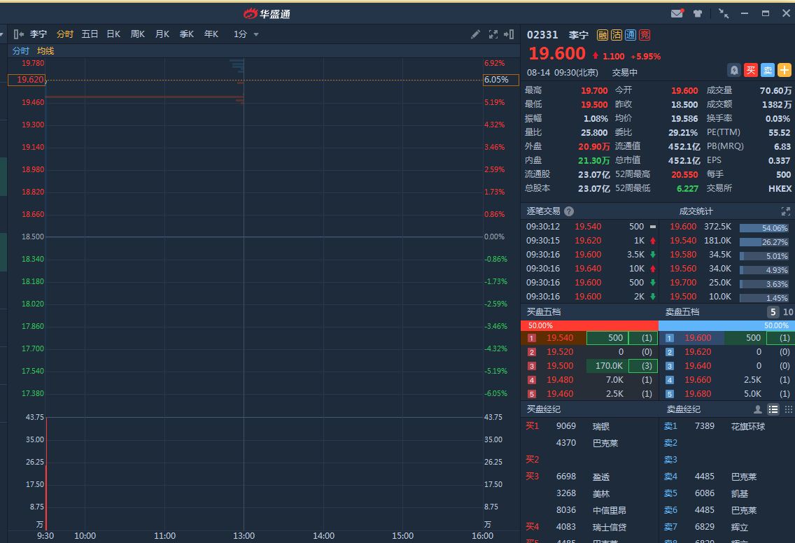 格隆汇8月14日丨李宁(02331.HK)高开近6%,报19.6港元,今年以来,其股价累计涨幅达到136%,成交495万港元,总市值452亿港元。