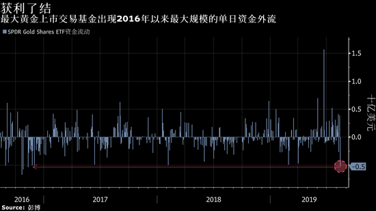 数据显示,规模达400亿美元的SPDR Gold Shares ETF在周二出现近5.23亿美元资金流出,创下2016年以来最大单日流出规模。
