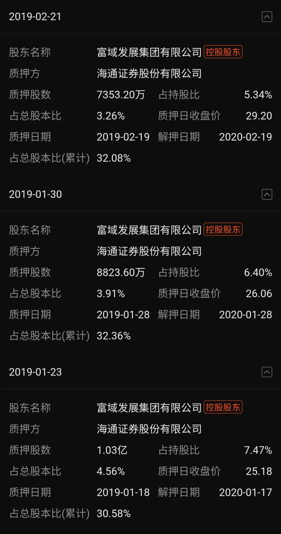 截至7月末,富域发展质押股数5.47亿股,占持股比39.69%,其中大部分质押给了海通证券和海通证券资产管理。据记者不完全统计,至少三笔质押未解押。