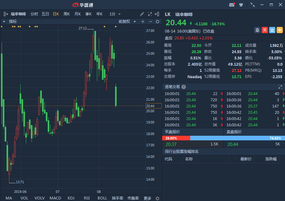 昨晚盘前瑞幸咖啡发布2019年第二季度财报,为上市以来首份财报。季度营收同比增超6倍,不过亏损持续扩大,叠加美股大盘暴跌,公司收跌16.74%至20.44美元,盘后涨超2%。