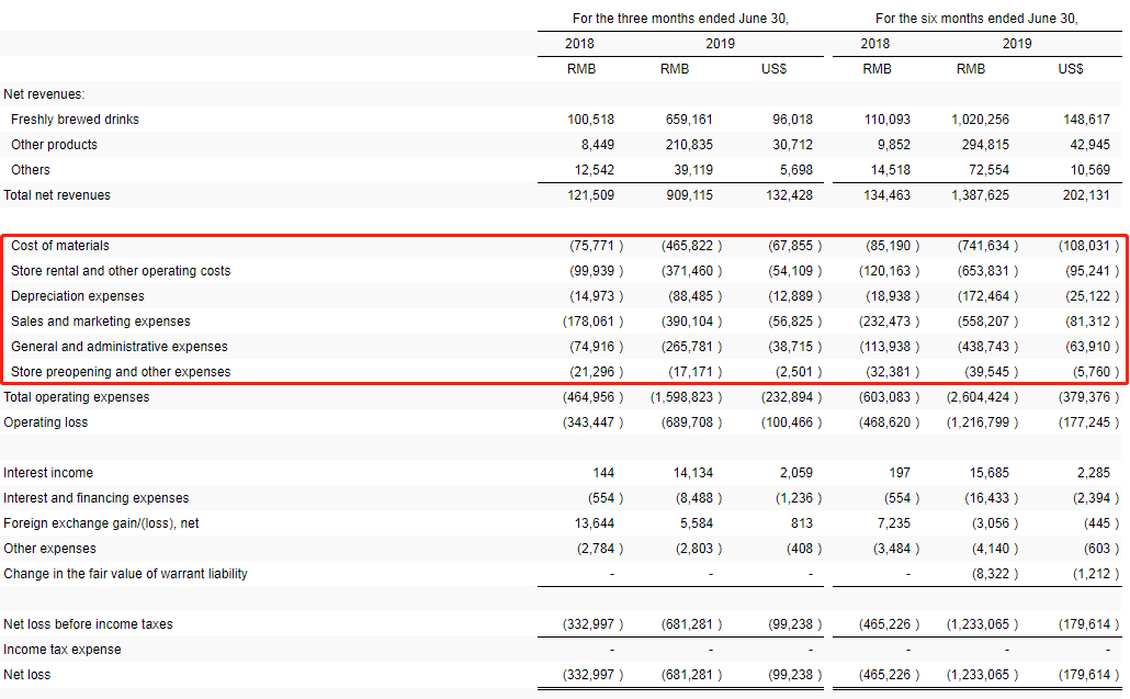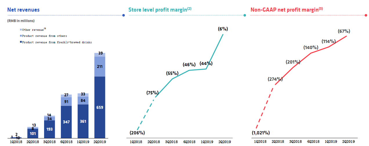 季度营收9.09亿元,同比增648.2%,分为三分部:新鲜酿造饮料、其他产品、其他收入(主要是运费收入),与产品销售相关的净营收(前两项)为人民币8.700亿元(约合1.267亿美元),同比增长698.4%,不过低于分析师预估的9.09亿元。占比方面,最主要的新鲜酿造饮料收入占比从上年同期的82.7%降至72.5%,其他产品则从去年同期的7.0%大增至23.2%。运费收入占比从上年的同期的10.3%降至4.3%。