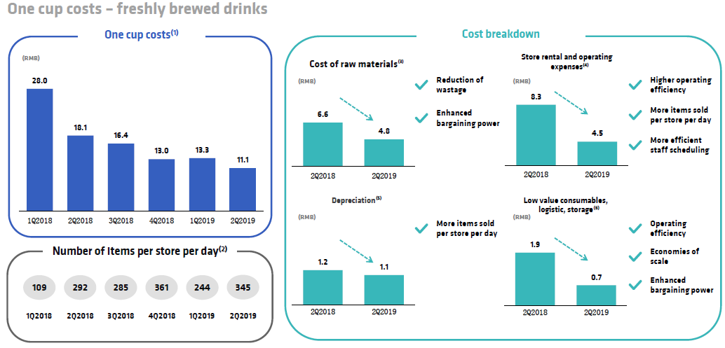 产品方面,7月初发布了除了咖啡以外的新品类产品“小鹿茶”,正式进军新鲜现制茶饮市场,客户群与咖啡的一致,咖啡指向上午消费群体,茶饮目标为下午和夜间消费者。公司将不断推出新品,将整体SKU保持在100中,其中咖啡比重将降低至20%至30%。