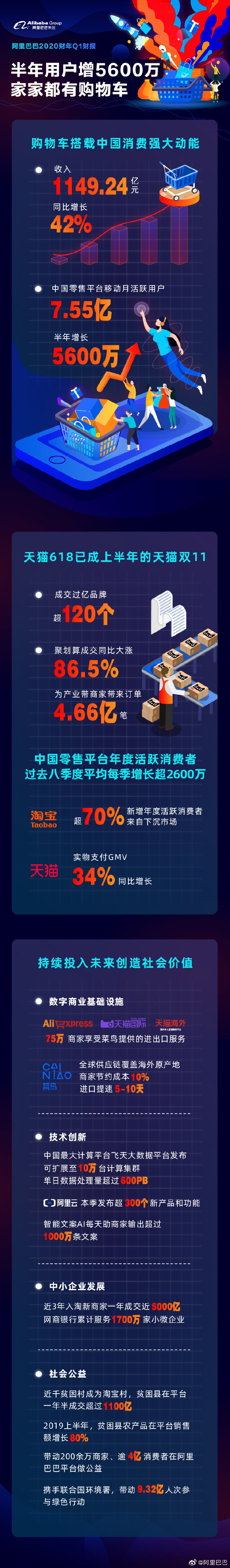 “我们以一个强劲的季度为本财年揭开序幕,收入同比增长42%,经调整EBITDA同比增长34%。”阿里巴巴集团首席财务官武卫表示︰“很高兴可以看到我们平台上用户互动及消费者支出均在持续增长。我们将继续投资于长期增长,同时提升投资领域的成本效益。”
