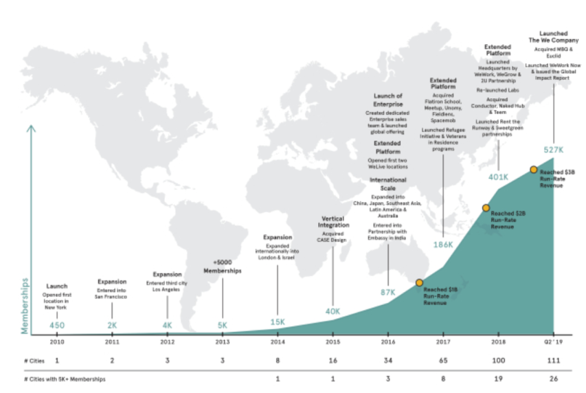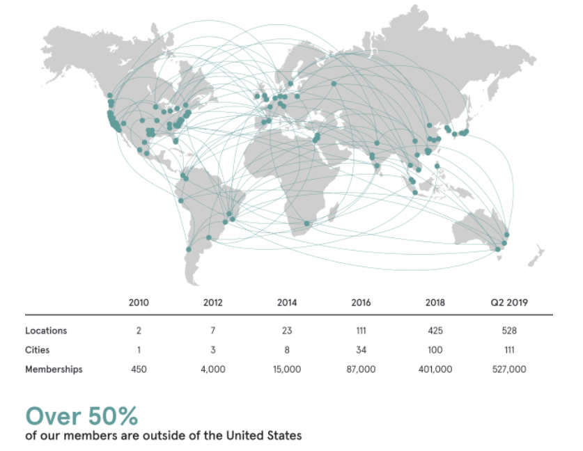 截止2019年6月30日,WeWork共在111个城市拥有528个办公场所,拥有52.7万会员,其中50%的会员来自于美国以外,40%的会员是员工人数超过500人的企业会员,预计这类企业会员将继续成为公司增长最快的会员类型。