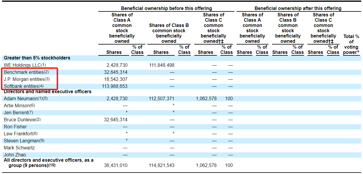 WeWork的股权阵容相当豪华,Benchmark、摩根大通、软银等知名投资机构均是其母公司“The We Company”的重要股东。其中,软银在WeWork上市前共持有1.14亿A类普通股,是除创始人外最大的股东。据披露,软银及旗下愿景基金自2017年1月1日以来,已经投资或承诺投资106.5亿美元。