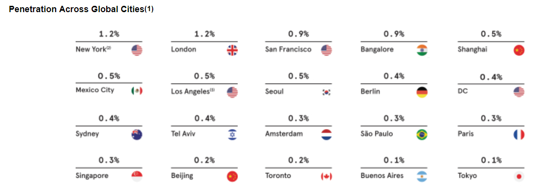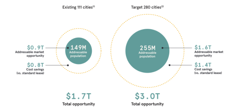 以截至2019年6月30日止六个月的每个会员的平均收入计算,预计公司现覆盖的111个城市的市场机会为9450亿美元。预计全球280个目标城市的总市场机会达到1.6万亿美元。