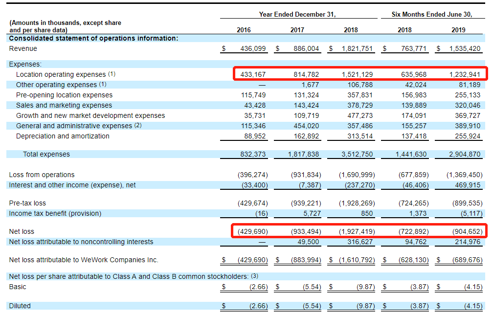 WeWork是将商用物业通过长租的方式承包下来,再短租给客户,这决定了它是一种重资产模式。这种模式下的高速增长都是建立在“烧钱”之上的,营收增长的同时,亏损也在不断扩张。2016年公司全年亏损4.29亿美元,2018年全年亏损额进一步扩大至19.27亿美元,今年上半年亏损也已经达9亿美元。