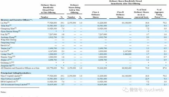 IPO后,孙雷持股为36.8%,拥有70.2%投票权;Nine Fortune Limited持股为22.5%,拥有9.4%的投票权;