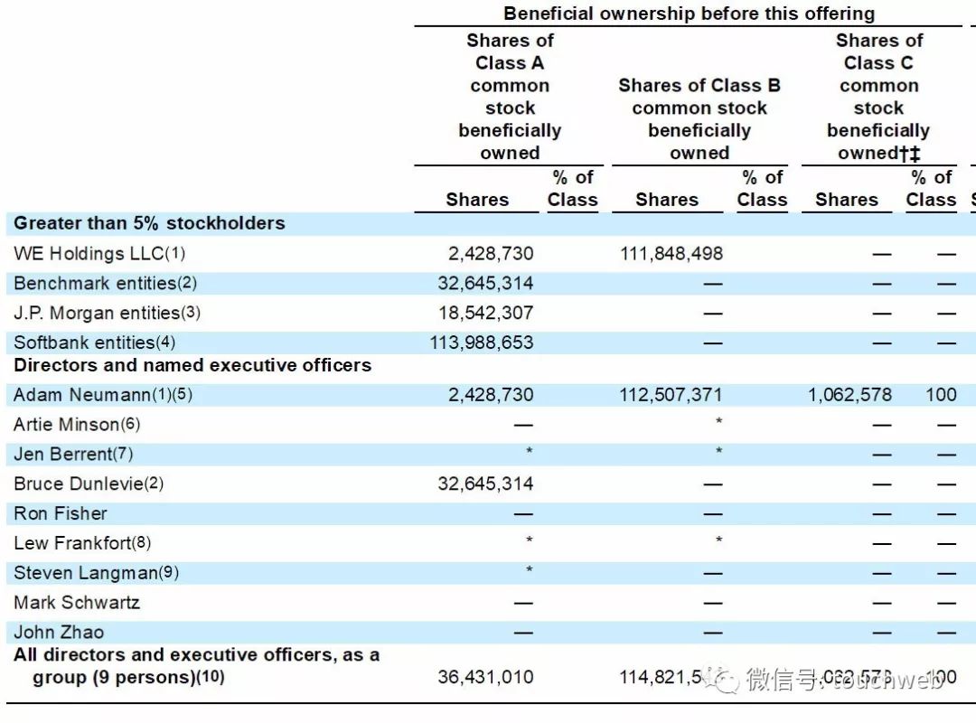 当前,We Holding是WeWork的最大股东,分别持有公司A类股2428730股、B类股111848498股。该公司由WeWork联合创始人兼首席执行官亚当·诺伊曼(Adam Neumann)控制,他本人也持有WeWork大量股票,包括2428730股A类股、112507371B类股以及1062578股C类股。