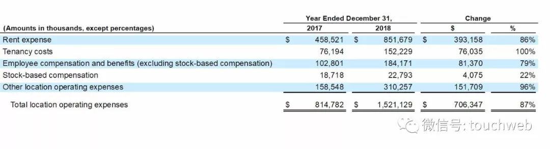 造成WeWork很难盈利的很大原因是,租金成本在持续的增高,WeWork在2018年的租金成本高达8.51亿美元,较上年同期的4.58亿美元增长86%。