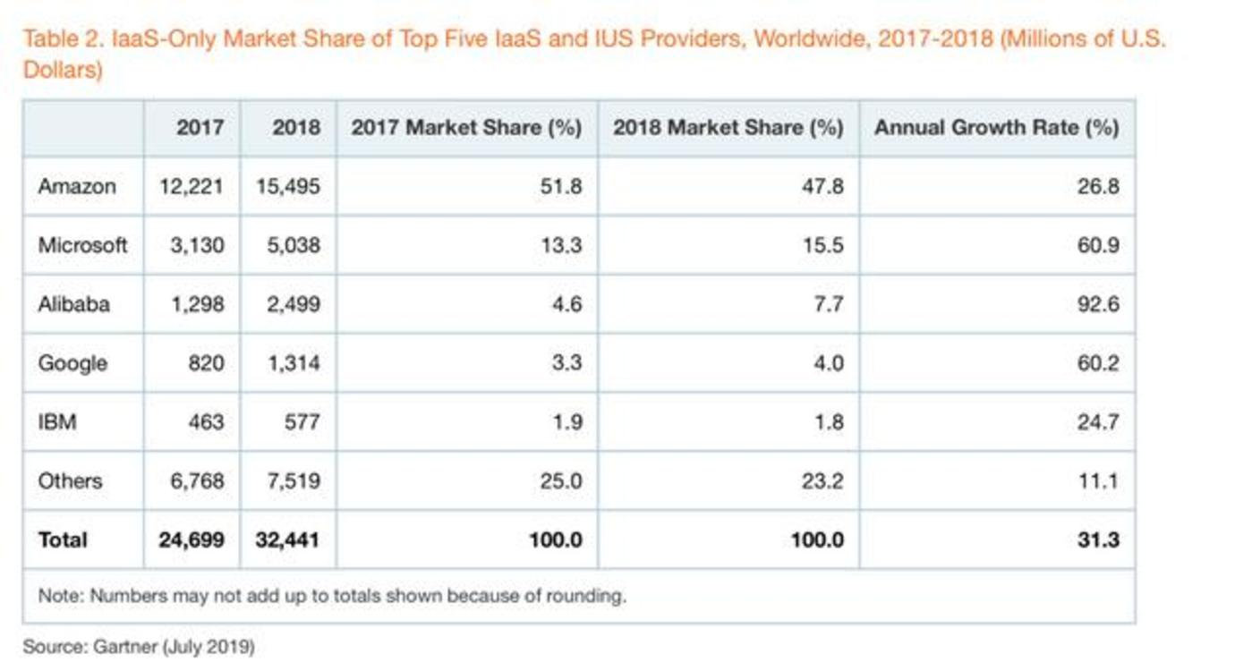 权威研究机构Gartner发布2018全球云计算市场数据,数据显示,亚马逊AWS在份额上仍占据第一,但由2017年的51.8%的份额下降至47.8%;微软市场份额增长2.2个百分点至15.5%,位居第二。中国云服务商阿里云相比去年增长3.3个百分点,占据全球市场7.7%的份额,位居第三,增速92.6%。虽说阿里云增速不错,但目前它跟亚马逊存在的差距还是很大,后续几大科技巨头之间的竞争也会更加激烈,阿里云能否保持高增速并不确定。