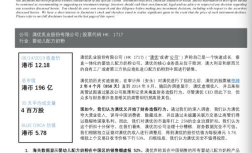 继辉山乳业之后,海外做空机构又盯上了澳优奶粉。8月15日,沽空机构Blue Orca Capital发布报告,质疑澳优误导中国消费者、虚报婴幼儿配方奶粉在中国区的销售额等,澳优的股票随即在港交所短暂停止买卖。