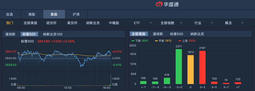 周四,美股收盘涨跌不一,其中道指涨0.39%,报25579.39点;标普500指数涨0.25%,报2847.60点;纳指跌0.09%,报7766.62点。