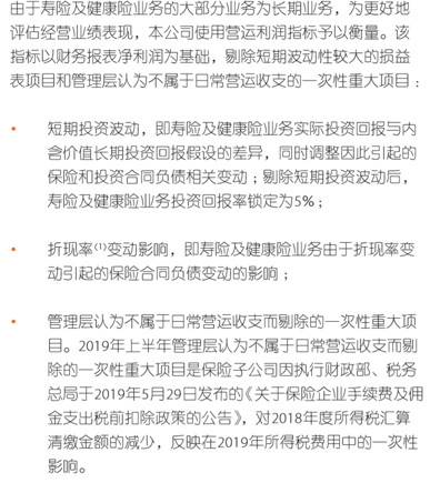 平安比较清楚的披露了一个营运利润的数据。营运利润的定义算是平安自创的一个词,简单的可以理解成扣除非经常性损益之后的利润。用保费做投资,有的钱购买债券,有的钱购买股票,不可能所有做投资赚的钱都归为非经常性损益,因此5%的投资收益率为限,5%的以内的收益就划入营运利润,5%以外的收益就不计入营运利润。