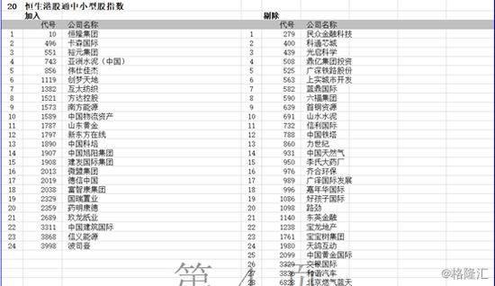 新加入的24只个股包括裕元集团(00551.HK)、亚洲水泥(中国)、南方能源(01573.HK)、药明康德(02359.HK)、信义能源(03868.HK)等个股,剔除的个股则有科通芯城(00400.HK)、六福集团(00590.HK)、中国铁塔(00788.HK)、宝宝树集团(01761.HK)、中国黄金国际(02099.HK)等个股。