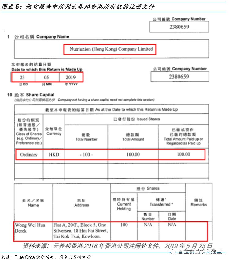 做空报告观点:云养邦香港由公司首席财务官王炜华 (Wong Wei Hua Derek)100%持有,与公告披露不符,由此认为云养邦是虚假交易和秘密输送利益的子公司。做空报告表示,澳优声称其拥有云养邦香港60%的股权,2019年7月,澳优宣布以人民币2.36亿元(主要通过增发股票)从澳优高管处收购云养邦香港剩余40%的股权。然而,香港公司注册文件清楚地显示,截至2018年5月23日和2019年5月23日,云养邦香港不是由澳优持有,而是由公司首席财务官王炜华 (Wong Wei Hua Derek)100%持有。由此做空报告认为,该收购实际上是一起为了让公司内部人士中饱私囊的虚假交易。