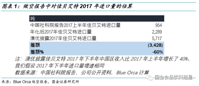 就这一点而言,做空报告存在两个问题:一是数据源非海关官方;二是以偏概全(用2017年1-6月数据年化得到全年数据未免太过片面)。据做空报告,其所依据数据均来自社科院所出报告,他们认为“中国社科院的报告是极其权威的,因为这篇报告是由政府下属的研究团队完成,而且被中国的主要媒体广泛报道”,而并没有采用正规、官方的海关数据。据澳优公告,该做空机构(Blue Orca)的数据来源是不准确且不专业的,中国海关发出的官方文件才是相关进口统计资料最可靠的数据来源。公司的佳贝艾特均为进口产品,受到海关的严格监管,有中国进出口检疫部门的检验,对外付汇是通过外汇管理部门进行,而这些行为都有来自官方详细的数字予以佐证,因此基于非官方数据源得到的结论是不准确且极具误导性的。其次,做空报告的一个关键假设在于他们假设2017下半年进口量增速相同,从而依据上半年数据对全年进口量进行了估算,并不是按照实际2017年全年的进口数据。据海关数据,2017年全年我国进口羊奶粉为11412吨,而上半年仅进口2438吨(占全年比重约21%),上半年数据明显不具有全年代表性。此外,据海关数据及公司披露,由于乳品下半年销售一般更高,因此往往下半年进口量会高于上半年,2017上半年佳贝艾特进口1362吨,下半年进口4452吨,因此上半年数据无法作为推断全年进口量的依据。因此我们认为,以不具有代表性的2017年上半年进口数据为依据得到的观点,是站不住脚的。