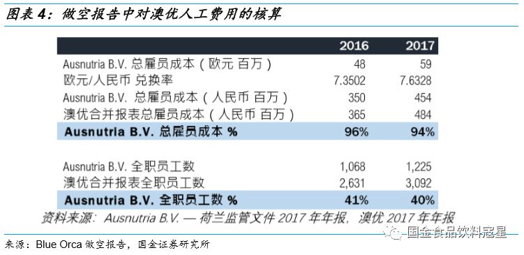 做空报告观点:荷兰监管文件表明澳优低报了人工费用,公司的实际盈利水平远低于其披露水平。做空报告表示,澳优披露其2017年的工资、薪金、退休金和人工相关费用为人民币4. 84亿元。而澳优绝大多数的婴幼儿配方奶粉都是在荷兰生产,工厂都归在荷兰子公司 Ausnutria, B.V. 旗下。据Ausnutria, B.V. 的荷兰监管文件显示,尽管 Ausnutria, B.V. (和其荷兰子公司)的员工人数只占了澳优总员工数的40%,但是其工资、薪金和退休金成本就占了澳优披露的该年全公司合并人工费用的94-96%。由此做空报告认为,澳优低报了人工费用。