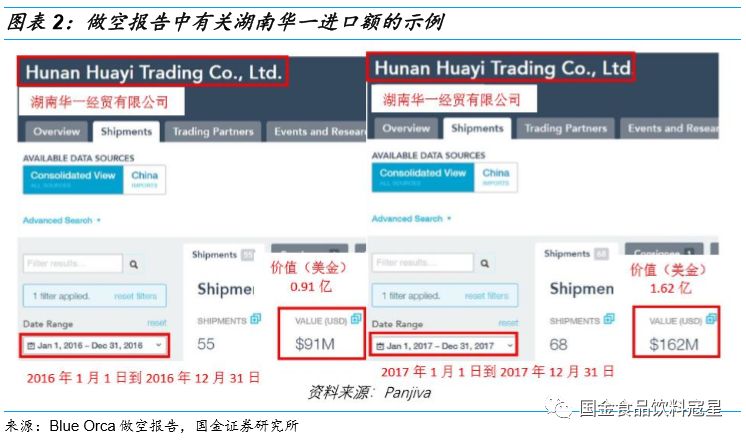 做空报告还认为:澳优的进口代理商(湖南华一)披露的进口额与公司销售额并不匹配,认为澳优虚报了中国区配方奶粉销售额。做空报告中表示,根据Panjiva汇总并提供的进口记录,近乎独家代理澳优的进口代理商湖南华一,在2016年和2017年分别只进口了价值0.91亿美元和1.62亿美元的婴幼儿配方奶粉产品。根据澳优的进口代理商披露的进口额,做空报告认为澳优虚报了2016、2017年的中国区配方奶粉销售额。