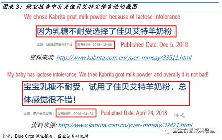我们认为,针对以上观点,做空报告存在三个问题:1)不理解中国奶粉新规;2) 不理解羊奶粉中具体成分含义;3)将“消费者评价”与“官方宣传语”划等号。首先,根据中国食药监局的规定:“产品名称中有动物性来源的,应当根据产品配方在配料表中如实标明使用的生乳、乳粉、乳清(蛋白)粉等乳制品原料的动物性来源。使用的乳制品原料有两种以上动物性来源时,应当标明各种动物性来源原料所占比例。”因此能够拿到中国的注册配方并上市销售的产品,都是经过了国家严谨的审核与检查。其次,市场监管局文件中明确规定,只需要对生粉或者乳粉标注动物性来源,对于乳糖则不需要标明动物性来源(因为乳糖只是一种简单的碳水化合物,无论是牛奶、羊奶还是母乳,分子结构与功能都是相同的),而佳贝艾特从未在产品配方中特意注明乳糖来自羊奶。此外,佳贝艾特从上市以来,公司一直主打宣传的是“100%羊乳蛋白婴配羊奶粉”,在中国官网上并未有“羊奶粉可以解决乳糖不耐受和牛奶过敏”此等宣传语。100%羊乳蛋白的优点是容易消化吸收、不易过敏,这一点也在北大的临床实验中获得过证明。而做空报告中所出示截图均来自佳贝艾特官网中的“消费者互动”板块,即用户评价,而非官方口径。我们认为,做空报告将“用户评价”与“官方宣传”划等号,明显是不合理的。
