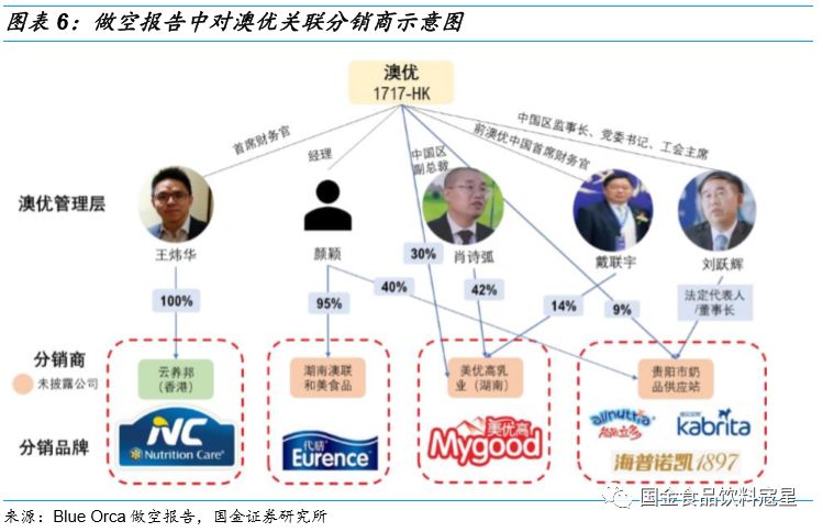 隐瞒关联方分销商?从不是秘密,“未披露”不等于“刻意隐瞒”做空报告观点:澳优隐瞒了众多关联方分销商,由此认为公司以牺牲股东利益为代价,秘密敛财。做空报告中指出3家澳优分销商,分别为:美优高,澳联和美以及贵阳奶品。美优高(湖南)由澳优的前财务总监组建,是澳优美优高品牌的主要营销和分销商;澳联和美由公司员工组建,是代膳品牌产品的主要分销商之一;贵阳奶品显示大股东为澳联和美,代理澳优品牌配方奶粉产品,包括佳贝艾特、海普诺凯和能力多。由此,做空报告认为,澳优刻意隐瞒了众多关联方分销商,公司以牺牲股东利益为代价,进行秘密敛财。