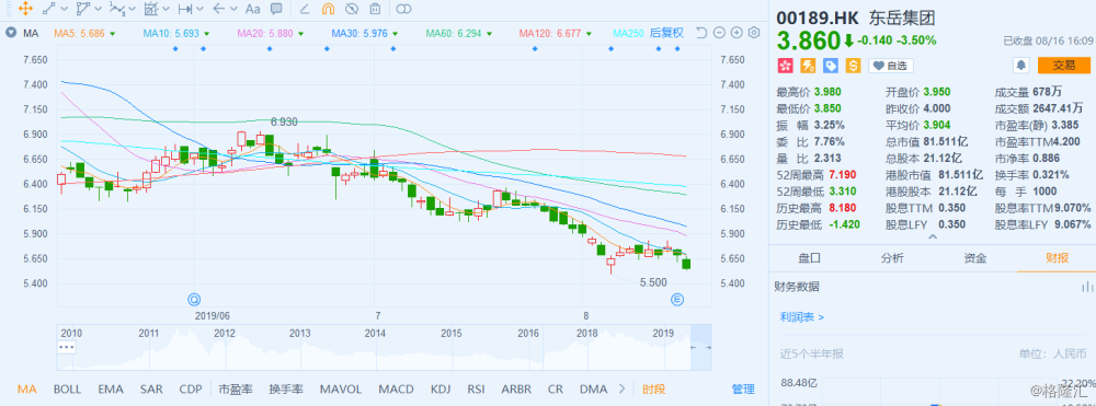 由于东岳集团此前已公告业绩预警,利空消息已提前开始释放,股价在近日来一路走低,所以今日股价波动略小。截至收盘,其股价报收3.860港元,跌3.5%,成交额2647.41万港元,最新总市值81.511亿港元。