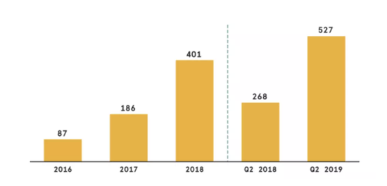 文件显示,从2016年到2018年,WeWork的收入分别为4.36亿美元、8.86亿美元、18.2亿美元,净亏损分别为4.3亿美元、8.8亿美元、16.1亿美元。增长超过4倍,但亏损也几乎以同样的速度在扩大。2019上半年,WeWork营收15.4亿美元,净亏损6.897亿美元。