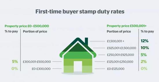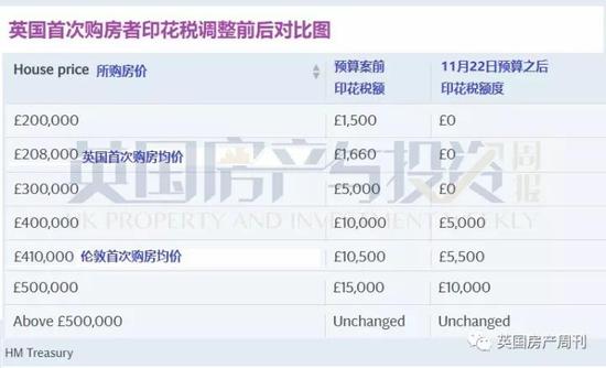 2017年11月,财相哈蒙德宣布:首次购房者购买低于30万英镑房产时将免除所有印花税;购买不超过50万英镑房产者,将免除30万英镑房价部份的印花税,其中30万及以下部分是免税的,30万至50万镑之间税率为5%。意味着80%的首次购房者将免缴印花税。