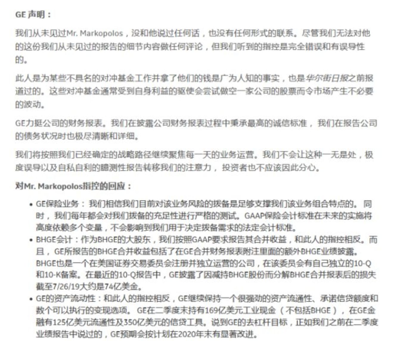 据钛媒体(微信ID:taimeti)了解的最新消息,目前通用电气已经在配合美国司法部和美国证交会对其会计行为的调查。 时隔二十多年,马科波洛斯此次将矛头指向通用,双方又将上演一场针锋相对的战斗。 不过也有机构支持通用电气。做空机构香橼研究(Citron Research)力挺通用电气,称马科波洛斯关于通用电气的报告是最糟糕的报告,称其自始至终都很虚伪。