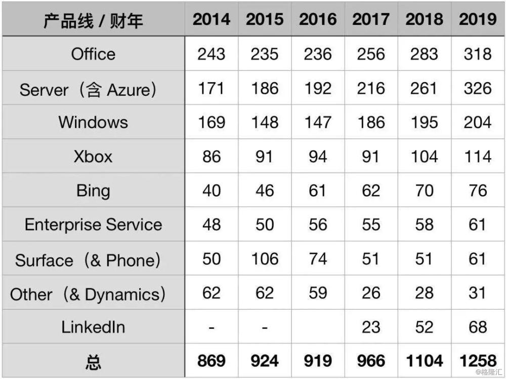 从 2014 年到 2019 年,微软市值是之前的 3 倍多,同期收入涨了多少?具体是哪些业务立功了?Windows 和 Office 呢?衰落了?衰落到什么程度了?Bing 搜索引擎呢?到底有多失败?是不是要放弃了?Azure 云服务呢?到底有多厉害,已经追上亚马逊 AWS 了?