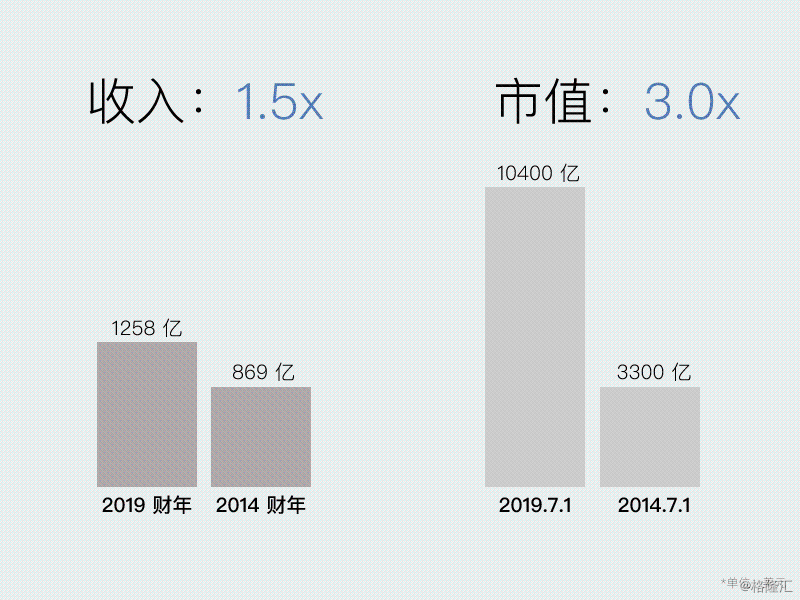 因为萨提亚·纳德拉 2014 年 2 月出任微软 CEO,所以对比微软 2014 财年和 2019 财年的数据(注:2014 财年对应自然时间是 2013Q3 ~2014Q2,以此类推),微软的年收入从 869 亿美元,增长到 1258 亿美元,是之前的 1.5 倍左右。