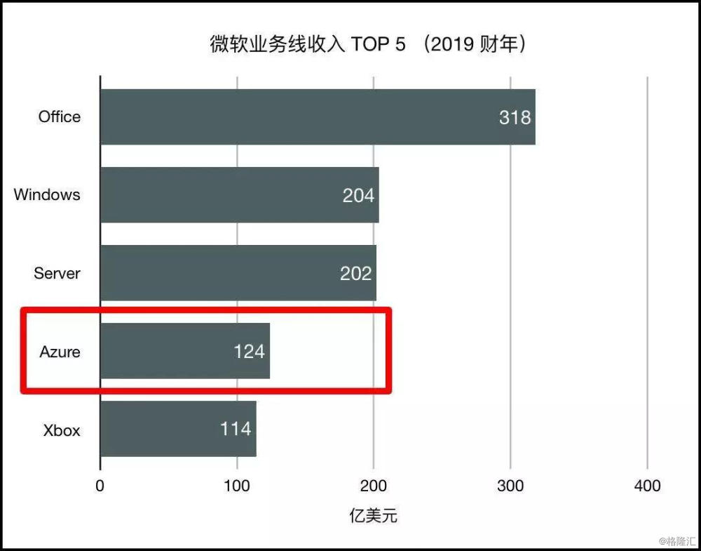 如果看 2019 财年,Azure 124 亿美元左右的年收入,已经可以排在 Office、Windows 和 Server 产品之后,排在第 4 位 。