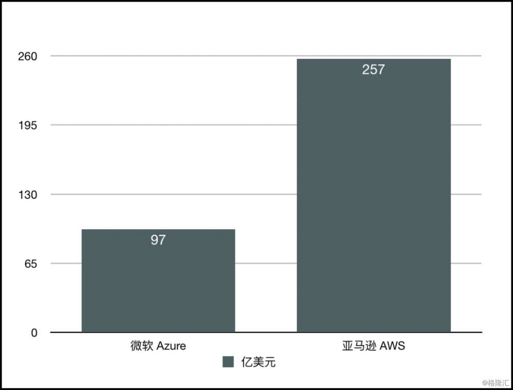 而根据亚马逊财报,Amazon AWS 在 2018 年自然年的收入为 257 亿美元。同一时期,微软 Azure 的收入为 97 亿美元左右。