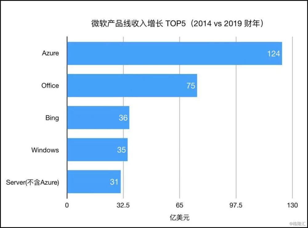 总结一下:这五年来,Azure 几乎是从零增长到年收入 124 亿美元业务。相当于萨提亚·纳德拉为微软公司新增了一条大腿。这条大腿的粗壮程度目前排在第四,过几年很有机会陆续超过服务器操作系统和个人电脑操作系统业务,成为公司第二。当然,乐观的话,也不是没有可能去跟 Office 老大哥争第一。