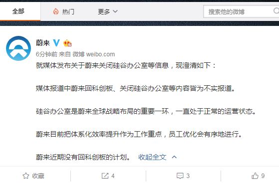 8月19日消息,蔚来通过微博回应回科创板、关闭硅谷办公室等内容,称皆为不实报道。