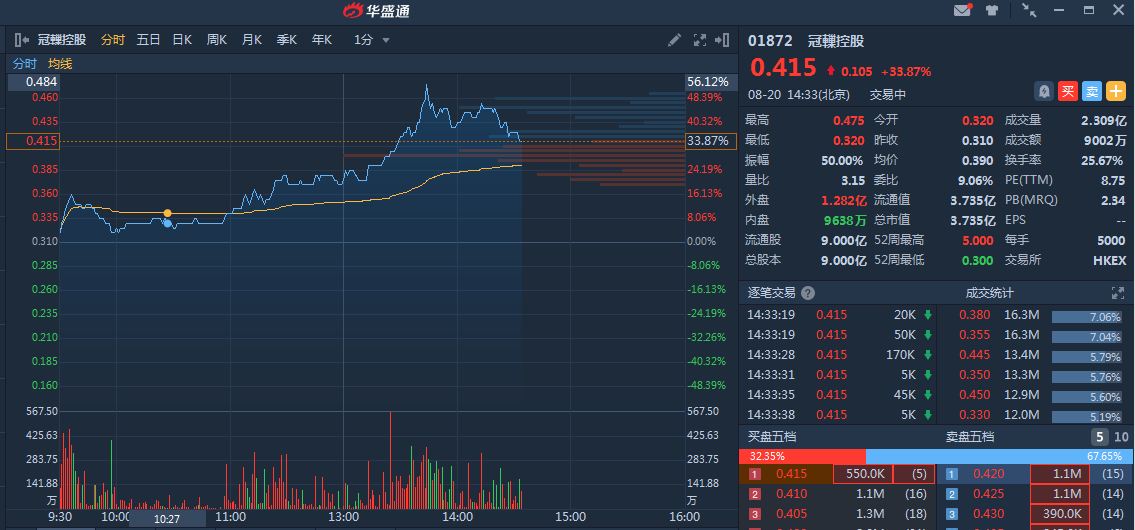 新浪港股讯,冠轈控股(01872)过去两日暴跌逾93%后,现反弹33.87%,报0.415元;成交约2.309亿股,涉资9002万元。