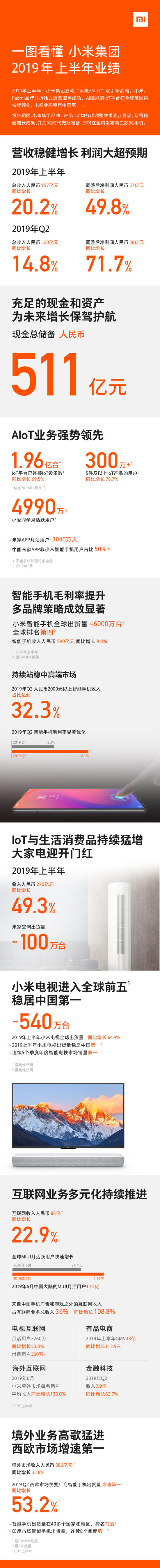 伴随中国大陆5G商用牌照的发放,5G技术正式进入商用阶段,被认为将在未来带动一轮新的全面的换机潮,并提振国内市场的总体需求。小米自2016年起就成立了5G预研团队,提前对5G标准展开了深入的研究工作。现在,小米已经为5G的正式商用做好了准备。小米首款5G智能手机小米MIX 35G版已于欧洲多个国家正式发售,下半年第二款5G智能手机也即将在中国上市。智能手机分部的毛利率由2019年第一季度的3.3%增长至2019年第二季度的8.1%。在市场从4G到5G切换的时期,我们会继续投资研发相关技术,同时维持稳健的现金流以及盈利能力,以加强投资能力,在5G技术广泛应用时把握5G的市场机会。