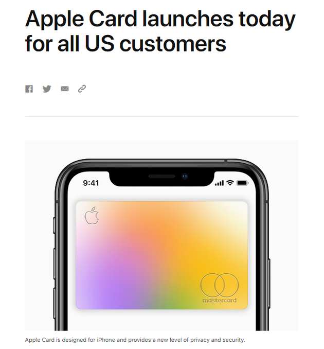 新浪科技讯 北京时间8月20日晚间消息,苹果官网刊出新闻,苹果Apple Card今天面向所有美国消费者推出。