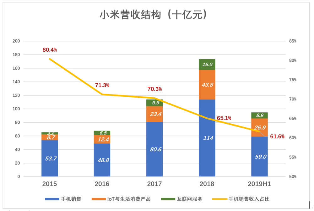 2019年H1,小米三大主营业务收入分别为:手机590亿、IoT与生活消费产品269亿、互联网服务89亿。其中手机销售收入占营收的比值从2015年的80.4%降至2019年H1的61.6%。