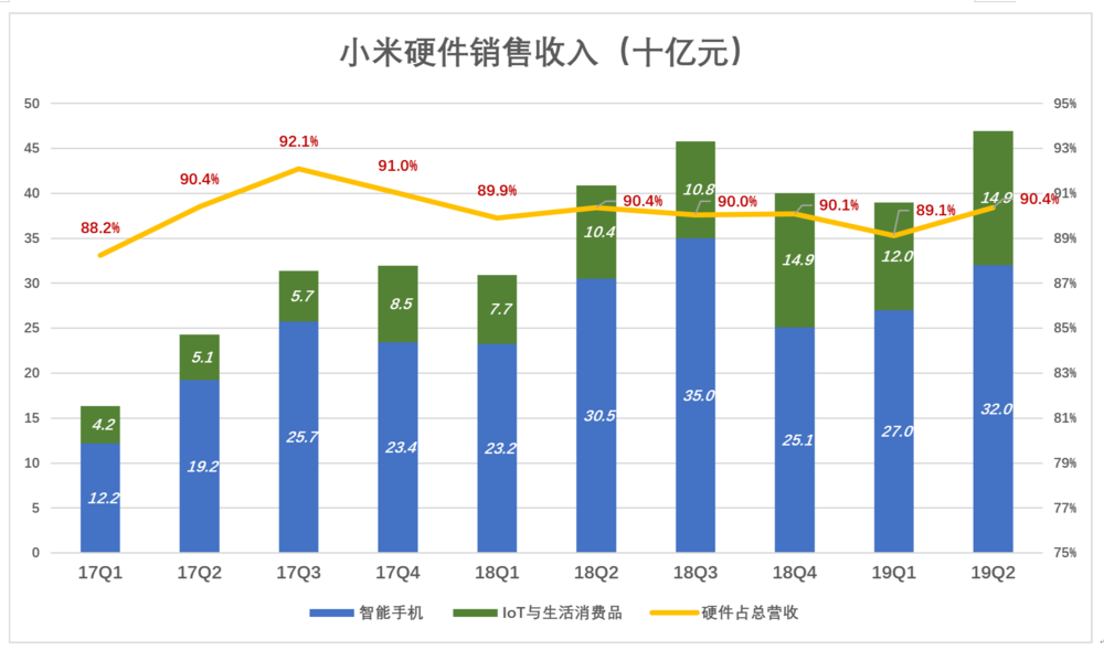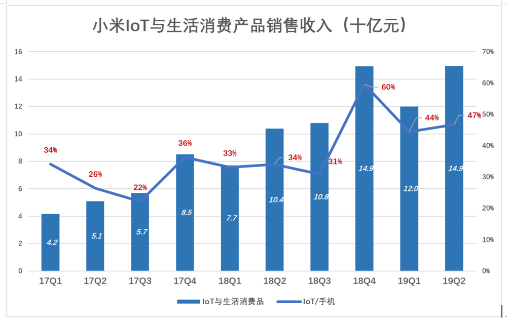 2019年1月11日,小米宣布“手机+AIoT”双引擎战略。2019年Q2,小米智能手机、Io T生活消费产品销售收入合计为469.7亿,占总营收的90.4%。