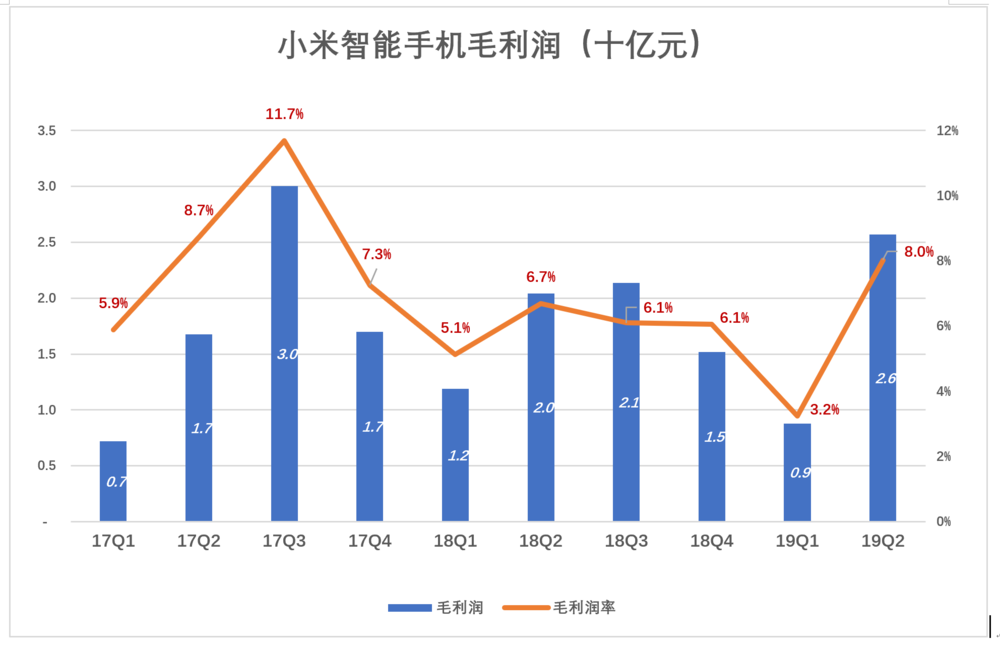 小米智能手机业务毛利润峰值出现在2017年Q3,达30亿,毛利润率11.7%。整个2018年,手机业务毛利润率都低于7%,2019年Q1更是跌至3.2%。2019年Q2情况发生了很大变化,智能手机业务毛利润率回升到8%,季度毛利润达25.7亿。