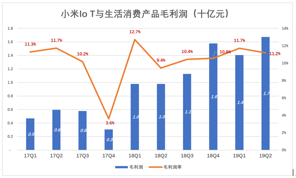 最近6个季度,IoT与生活消费产品毛利润率都在10%以上。2019年Q1,毛利润14亿,一度超过智能手机,毛利润率上升到11.7%。2019年Q2,毛利润17亿,毛利润率11.2%。