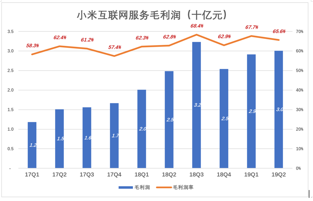 2018年Q3,小米互联网服务毛利润率创纪录地达到32亿,毛利润率68.4%。2019年Q2,毛利润率回落到65.6%,毛利润30亿,比卖手机多赚10个亿。