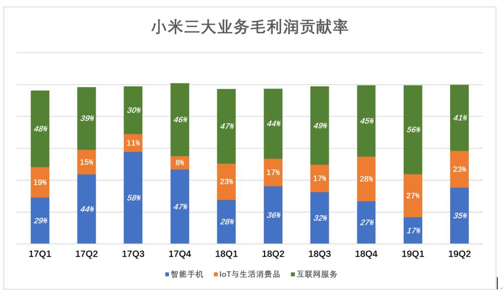 最后看一下小米三大业务的毛利润贡献率:2019年Q1,互联网服务贡献了毛利润率的58%,IoT与生活消费品贡献了27%,智能手机只贡献了17%;2019年Q2,智能手机贡献率翻倍,达到35%,但互联网服务贡献率还是要高6个百分点,达41%。
