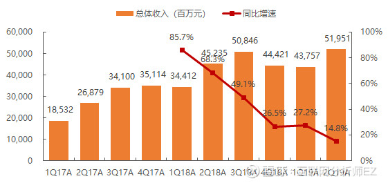 图:小米总体收入及同比增速(1Q17A-2Q19A)