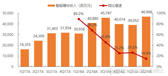 图:小米智能硬件业务收入及同比增速(1Q17A-2Q19A)